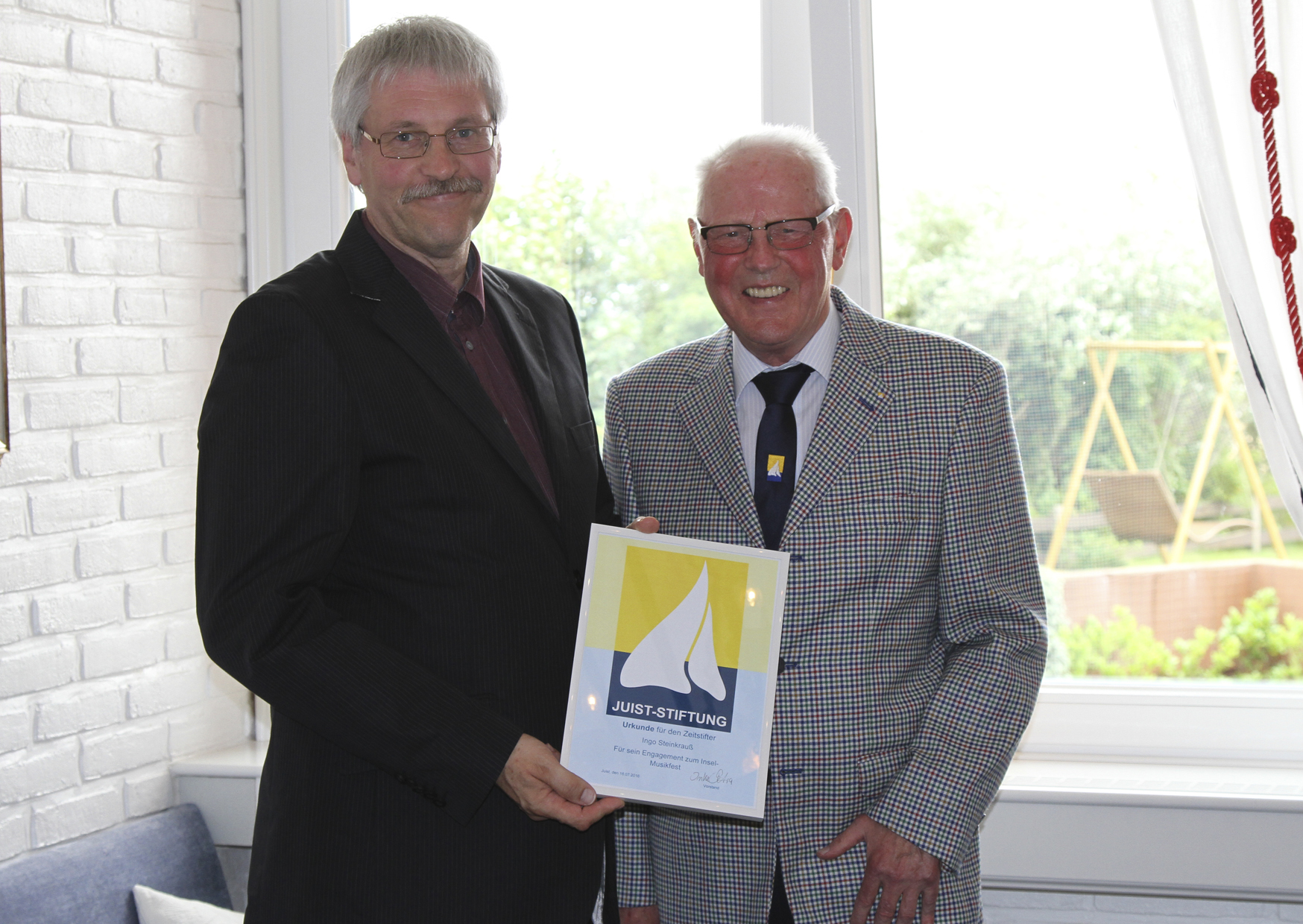 Da sich die Vereine für die Unterstützung revanchieren, indem sie alljährlich beim Fest zum Tag der Stiftungen Ende September auftreten, hatte der Vorstand einen auch auf dem Festland bekannten Juister zur Verleihung der Urkunde „Zeitstifter des Jahres“ eingeladen: Ingo Steinkrauß. Der aus Aurich stammende Standesbeamte und Hobbymusiker – Schlagzeuger beim Musikverein Harmonie und bei Juist4Fun – lebt seit über 20 Jahren auf Juist und organisiert seit 2009 das Inselmusikfest auf dem Kurplatz oder im Haus des Kurgastes. Dieter Brübach bedankte sich im Namen der Stiftung „für die souveräne Organisation, auf die wir auch in Zukunft gerne zurückgreifen“.