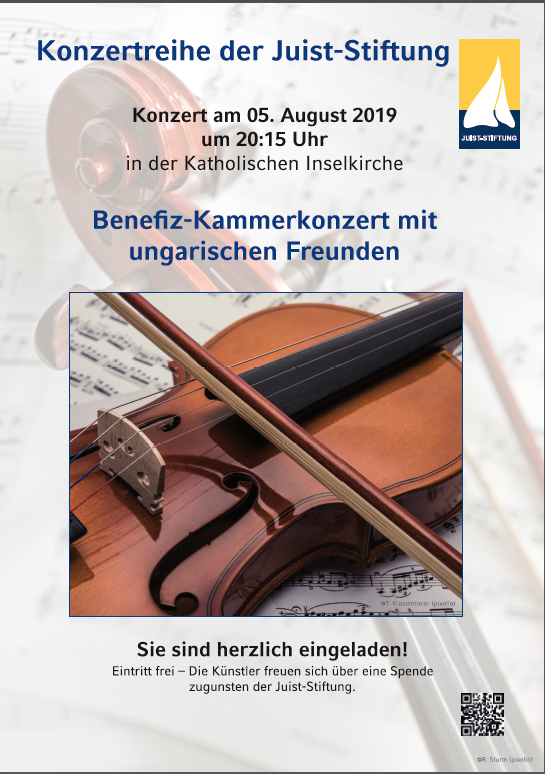 August 2019: In der Konzertreihe der Juist-Stiftung gab es kürzlich ein Benefiz-Konzert in der Katholischen Inselkirche. Als „Kammerkonzert mit ungarischen Freunden“ angekündigt, verbarg sich hinter dieser Bezeichnung das Ungarische Kurorchester. Leider blieben viele Plätze in der Kirche unbesetzt, was sicher auch an dem etwas unglücklichen Termin lag, denn zeitgleich fand die beliebte Veranstaltung „Loog in Flammen“ mit einem Konzert des Musikzuges der Freiwilligen Feuerwehr statt.