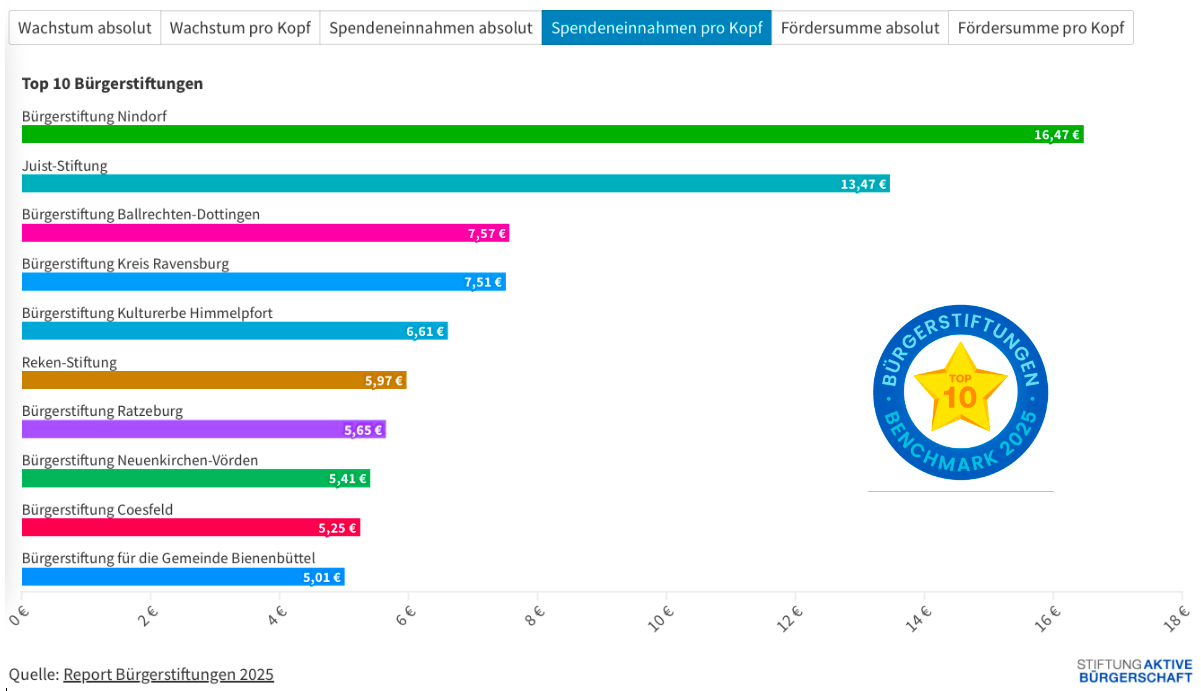 Mit dem „Benchmark Bürgerstiftungen“ liegt eine Analyse des Wachstums, der Spendeneinnahmen und der Fördersummen für die Jahre 2023 und 2024 vor. André Ebbighausen, der im Vorstand der Juist-Stiftung für die Finanzen zuständig ist, betont: „Natürlich können wir bei den absoluten Wachstums-Zahlen nicht mit anderen Stiftungen mithalten, denn die Skala der ersten zehn startet dort schon bei 800.000 Euro. Allerdings sind wir beim Wachstum pro Kopf mit dem 4. Platz gut dabei.“