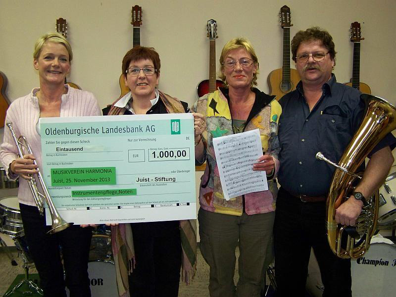 Große Freude im November 2013 beim Musikverein „Harmonia“. Beim letzten Übungsabend in der Inselschule kamen Inka Extra und Uda Haars von der Juist-Stiftung dazu, um einen Scheck zu übergeben. Die Bürgerstiftung hatte sich nämlich dazu entschieden, dem Juister Musikverein einen Betrag von 1.000 Euro für Instrumentenpflege und Noten zu übergeben.
