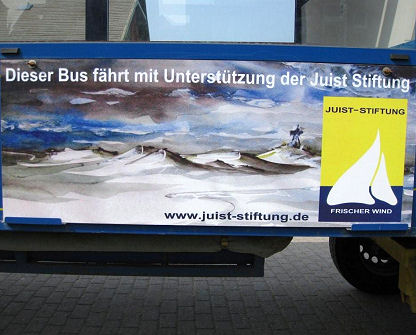 Auf der autofreien Insel Juist gibt es auch Busse – Pferdebusse. Der Kindergarten der Ev.-lth. Kirche liegt im westlichen Teil, im Loog. Für die Kinder aus dem östlichen Teil der Insel ist er schwer zu erreichen. Daher fährt täglich der Bus, von unseren treuen Pferden gezogen, zwei mal zum Loog hin und zurück. Er befördert die jüngsten Einwohner. Der Bus finanziert sich zum größten Teil aus Spenden. Darunter, schon im zweiten Jahr, die Juist-Stiftung. Unschwer zu erkennen an der schönen Werbung, die sich am Bus befindet. Sie wurde von dem Juister Künstler Dieter Rother gestaltet. Wir freuen uns einen Beitrag für die Kinder leisten zu können.