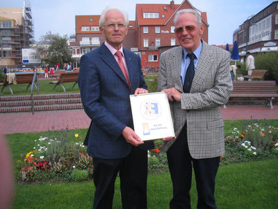 Herr Dieter Isensee, Vorstand der Bürgerstiftung Nienburg und zuständiges Mitglied im Bundesverband für den Norddeutschen Raum, ließ es sich nicht nehmen, die Insel Juist zu besuchen und uns das Gütesiegel persönlich zu überreichen. Er kam bereits am Samstag, so dass wir uns am Vorabend der Veranstaltung zu einem Erfahrungsaustausch im Friesenhof treffen konnten. Herr Isensee zeigte sich beeindruckt von der Höhe unseres Gründungskapitals, das wir in so kurzer Zeit auf unserer kleinen Insel einwerben konnten. Ebenso lobte er die Vielzahl der Aktivitäten, die die Juist-Stiftung bereits in den wenigen Monaten ihres Bestehens anpackte.
