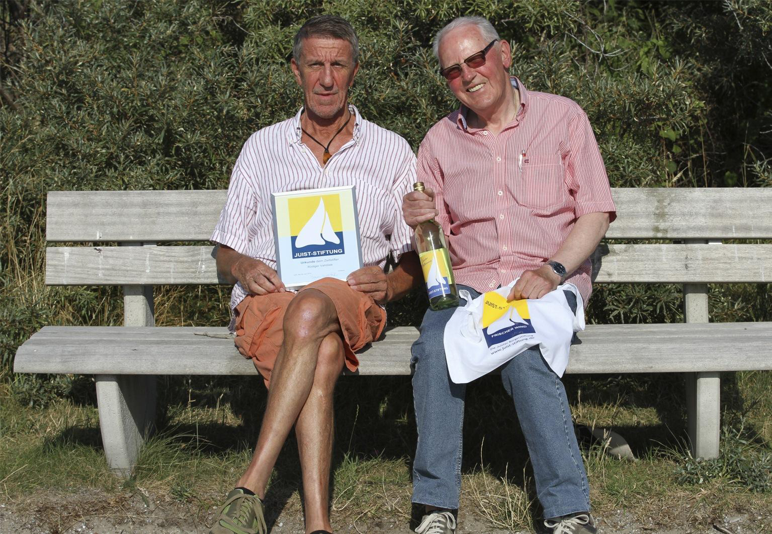 Juli 2014: Zweimal die Woche, dienstags und donnerstags, schwingt sich Rüdiger Vahldiek nach der Arbeit auf sein Rad und fährt Richtung Hafen. Sein Ziel sind die Bouleplätze An‘t Diekskant, die die Juist-Stiftung vor vier Jahren dort anlegen ließ. Und was für Rüdiger Vahldiek ein entspannendes Hobby ist, ist für die Juist- Stiftung ein wesentlicher Eckpfeiler ihrer Arbeit: „Ohne Stifter wie dich, lieber Rüdiger, wäre die Stiftung in der Öffentlichkeit nicht so bekannt“. Mit diesem Satz würdigt Dieter Brübach, der Stiftungsvorstandsvorsitzende der Juist-Stiftung, den Zeitstifter Vahldiek bei der Aushändigung einer Ehrenurkunde.